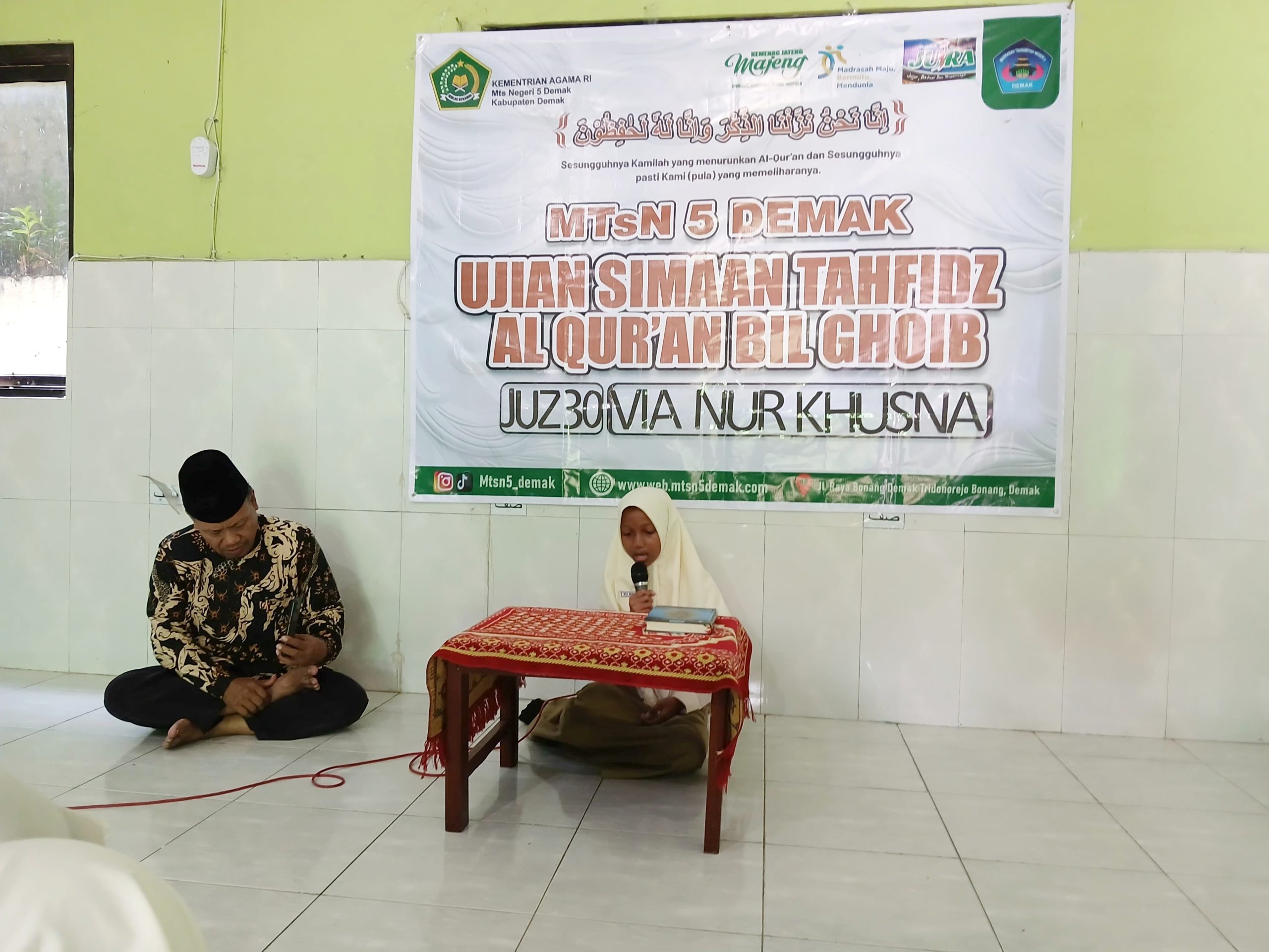 Demak – MTs Negeri 5 Demak melaksanakan kegiatan Simakan Al-Qur’an juz 30 oleh saudari Via Nur Khusna yang merupakan siswi kelas VII program tahfidz. Kegiatan ini diperuntukkan bagi peserta didik yang telah menyelesaikan hafalan satu juz. Dalam pelaksanaannya, siswa diwajibkan menyetorkan hafalan satu juz secara penuh sebagai syarat untuk melanjutkan hafalan pada juz berikutnya.