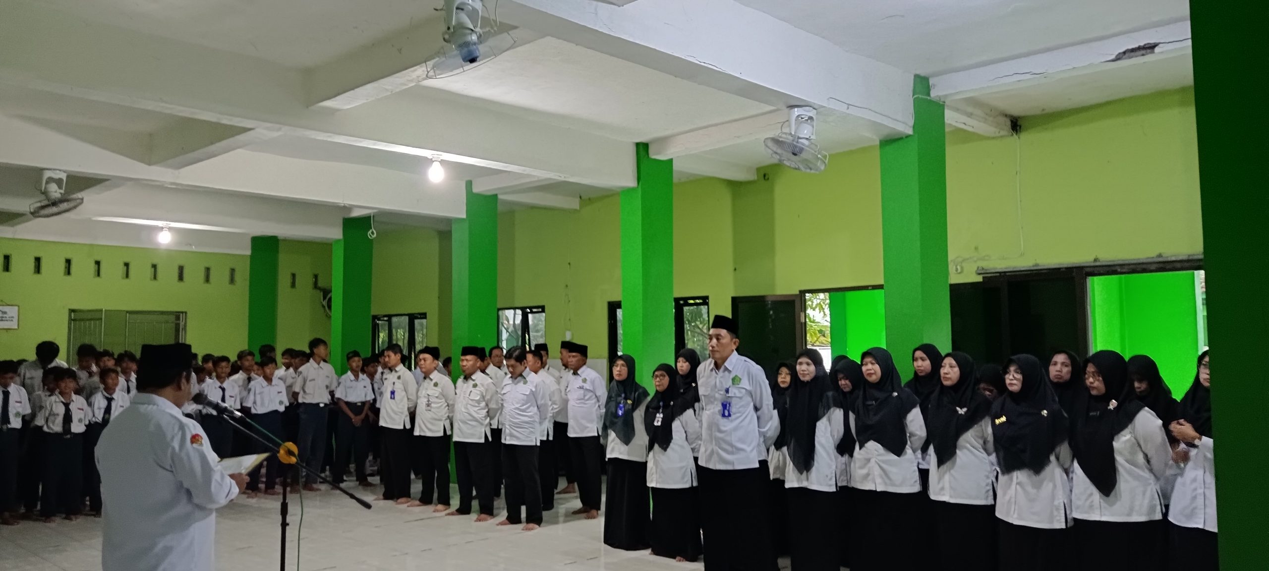 Meski lokasi berpindah ke ruang yang lebih terbatas, suasana khidmat tetap menyelimuti seluruh peserta yang terdiri dari jajaran guru, staf, serta siswa-siswi. Suara lantunan lagu kebangsaan Indonesia Raya tetap menggema di dalam dinding musholah, menandai dimulainya rangkaian acara dengan penuh dedikasi.